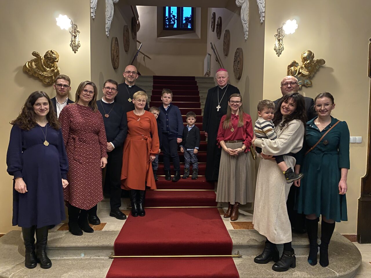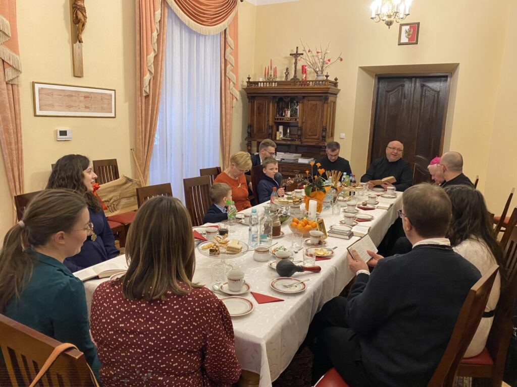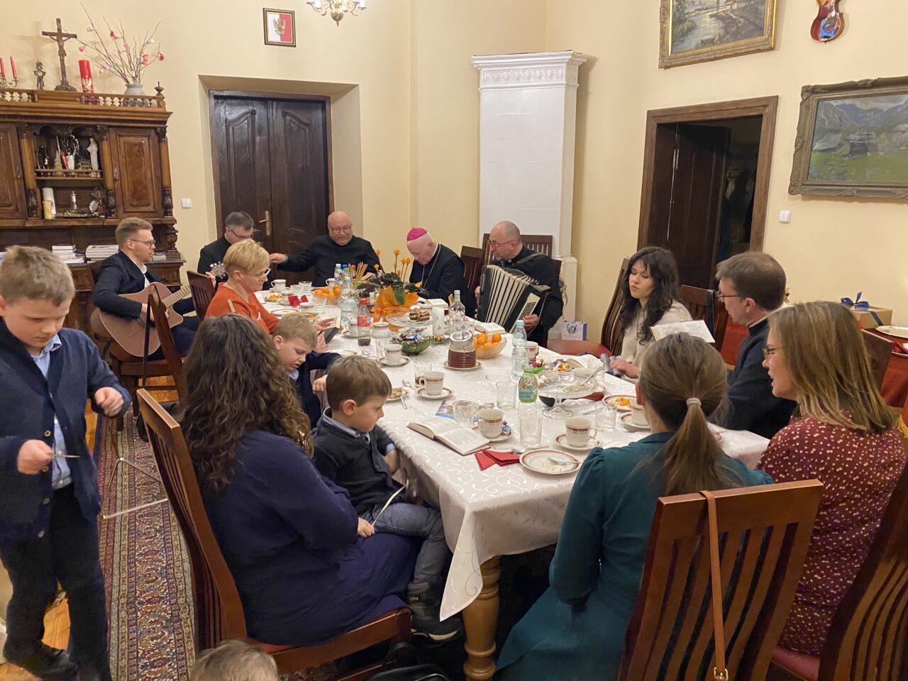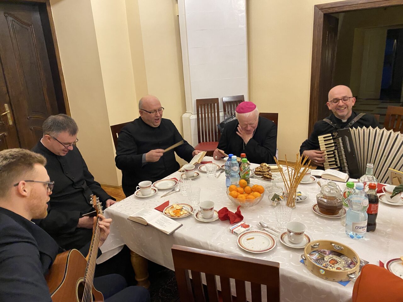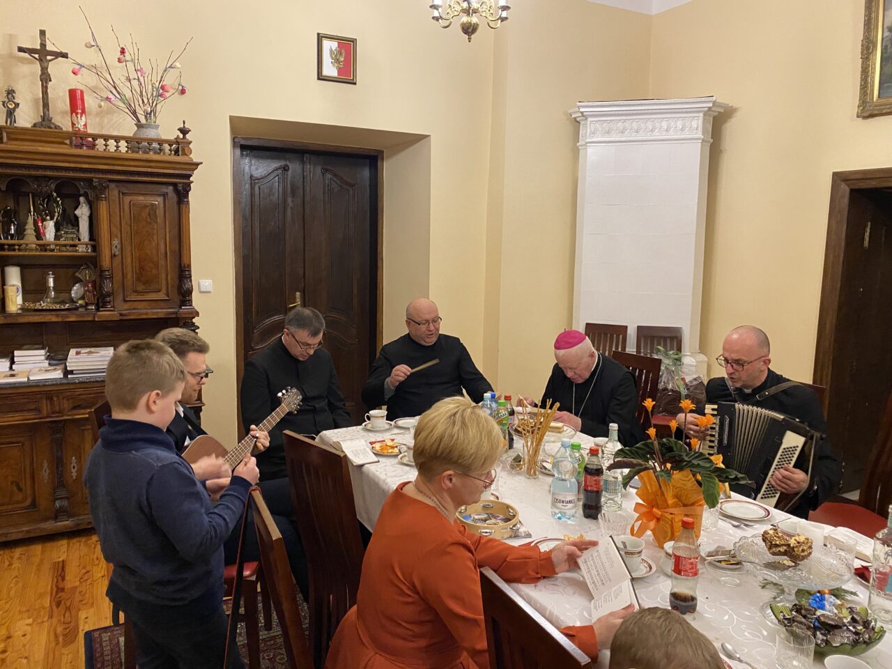 W czwartek 22 stycznia w Domu Biskupim odbyło się coroczne spotkanie kolędowe, na które przybyła Wspólnota Życia Miłosiernego Chrystusa Sługi z Wrocanki wraz z przedstawicielami Oazy Dorosłych. Centralnym punktem była modlitwa oraz wspólny śpiew kolęd, którym towarzyszył akompaniament akordeonu i gitary, nadający temu kolędowaniu wyjątkowy, uroczysty charakter.